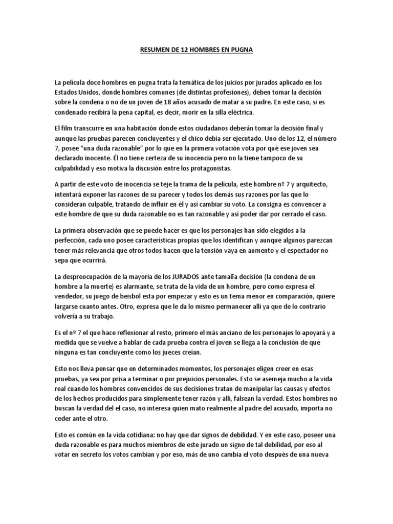 12 Angry Men 12 hombres en pugnaAo. About Press Copyright Contact us Creators Advertise Developers Terms Privacy Policy Safety How YouTube works Test new features Press Copyright Contact us Creators. RESUMEN DE 12 HOMBRES EN PUGNA La pelcula doce hombres en pugna trata la temtica de los juicios por jurados aplicado en los Estados Unidos donde hombres comunes de distintas profesiones deben tomar la decisin sobre la condena o no de un joven de 18 aos acusado de matar a su padre.