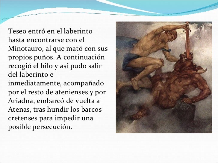 Existen diferentes historias sobre cmo lleg a entrar Teseo en el laberinto una de ellas habla de que Teseo se ofreci como uno de los sacrificios para poder entrar mientras que otras historias hablan de que fue Minos quien eligi a Teseo ya que era una figura muy importante de Atenas. Es un resumen muy corto del mito. Su relevancia nace de su gran amplitud y por ello y para conocer en profundidad sus elementos en esta leccin de unPROFESOR te ofrecemos un resumen de la mitologa griega y.
